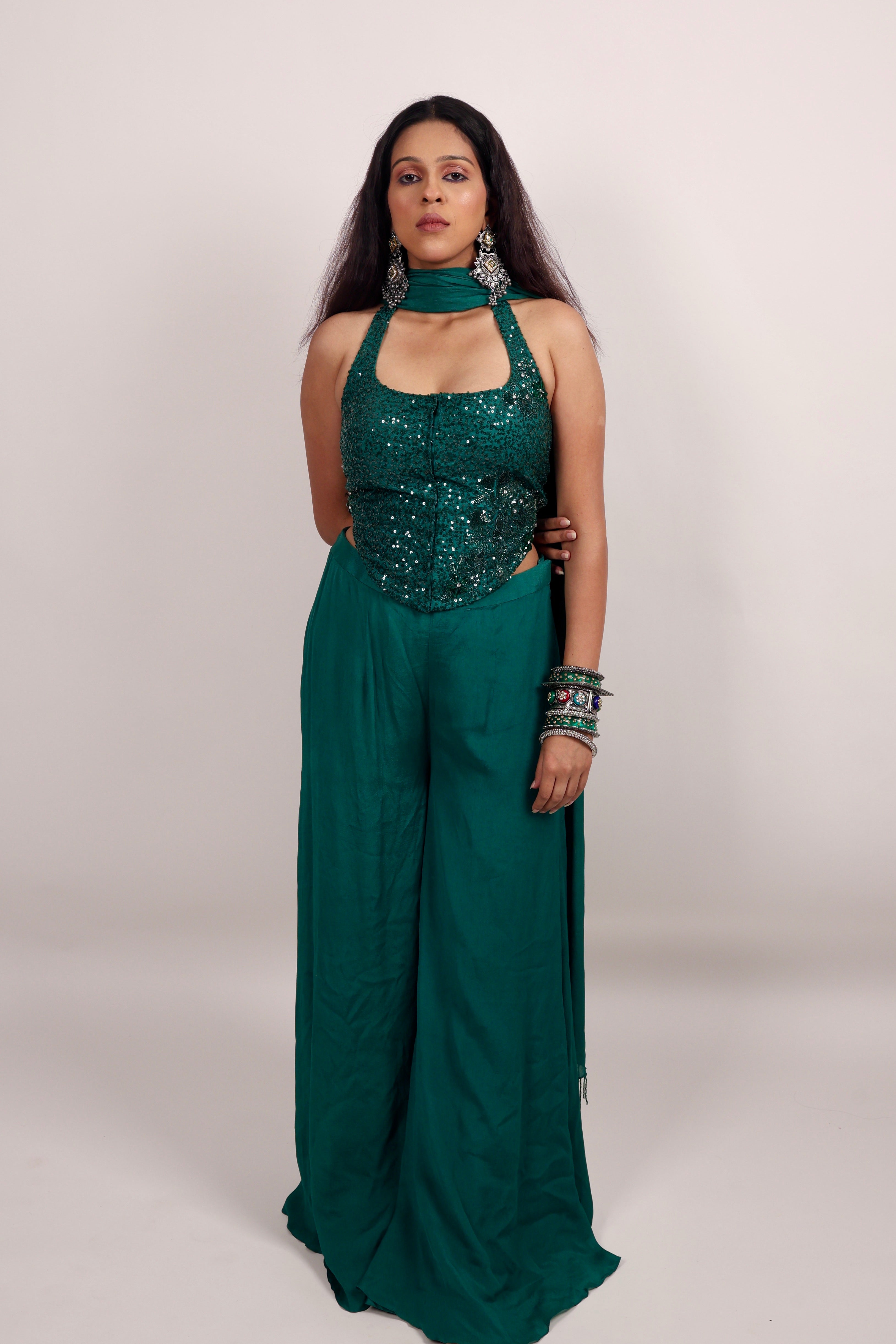 From Rs. 31,000.00From Rs. 31,000.00Emerald green corset top with sequin handwork paired with wide palazzo pants. The halter neckline and fitted bodice give it a structured yet feminine look —...