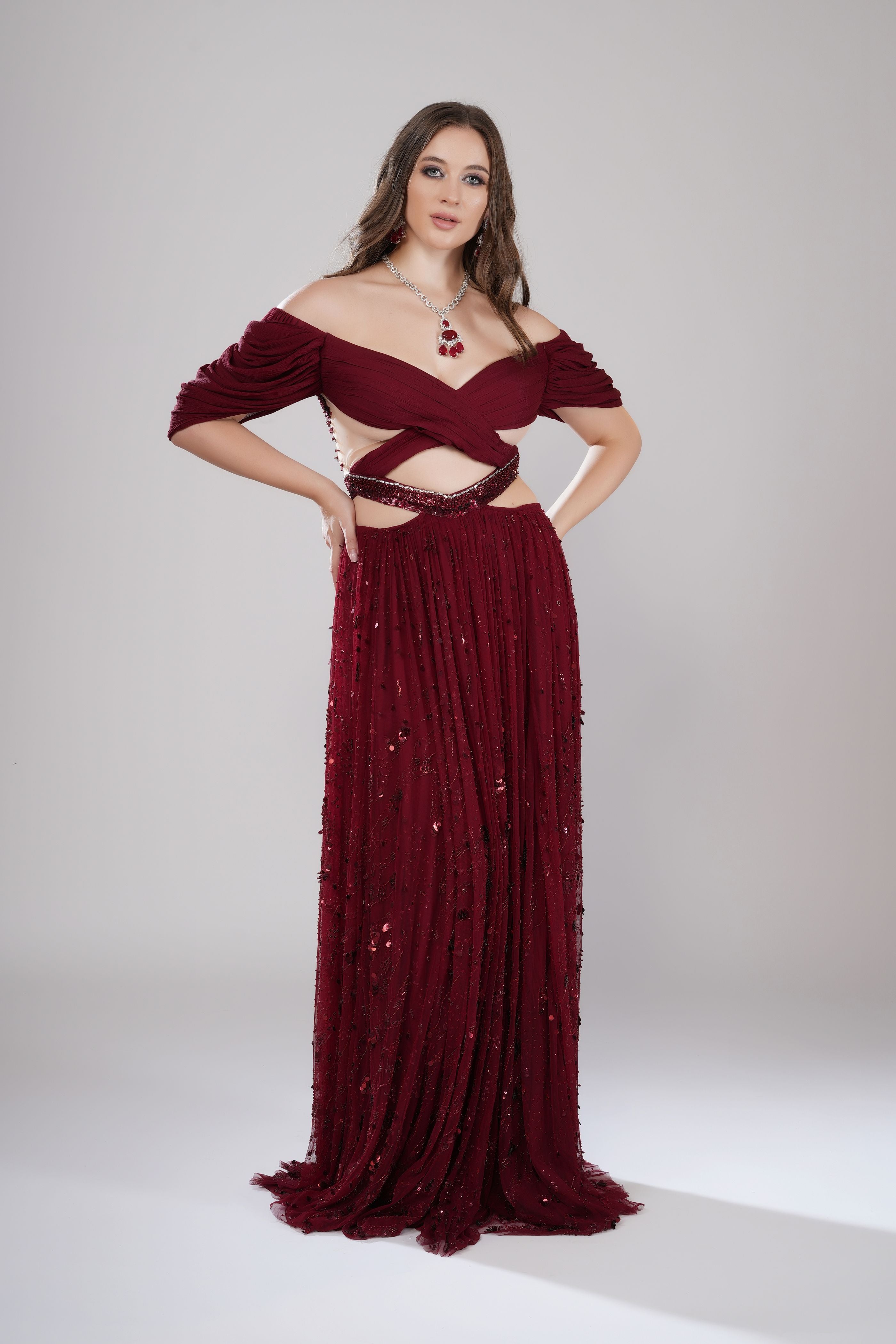 From Rs. 65,000.00From Rs. 65,000.00A deep red gown featuring an off-the-shoulder design with a crisscross bodice and shimmering embellishments. The deep red pleated skirt flows gracefully, while cutout details at...
