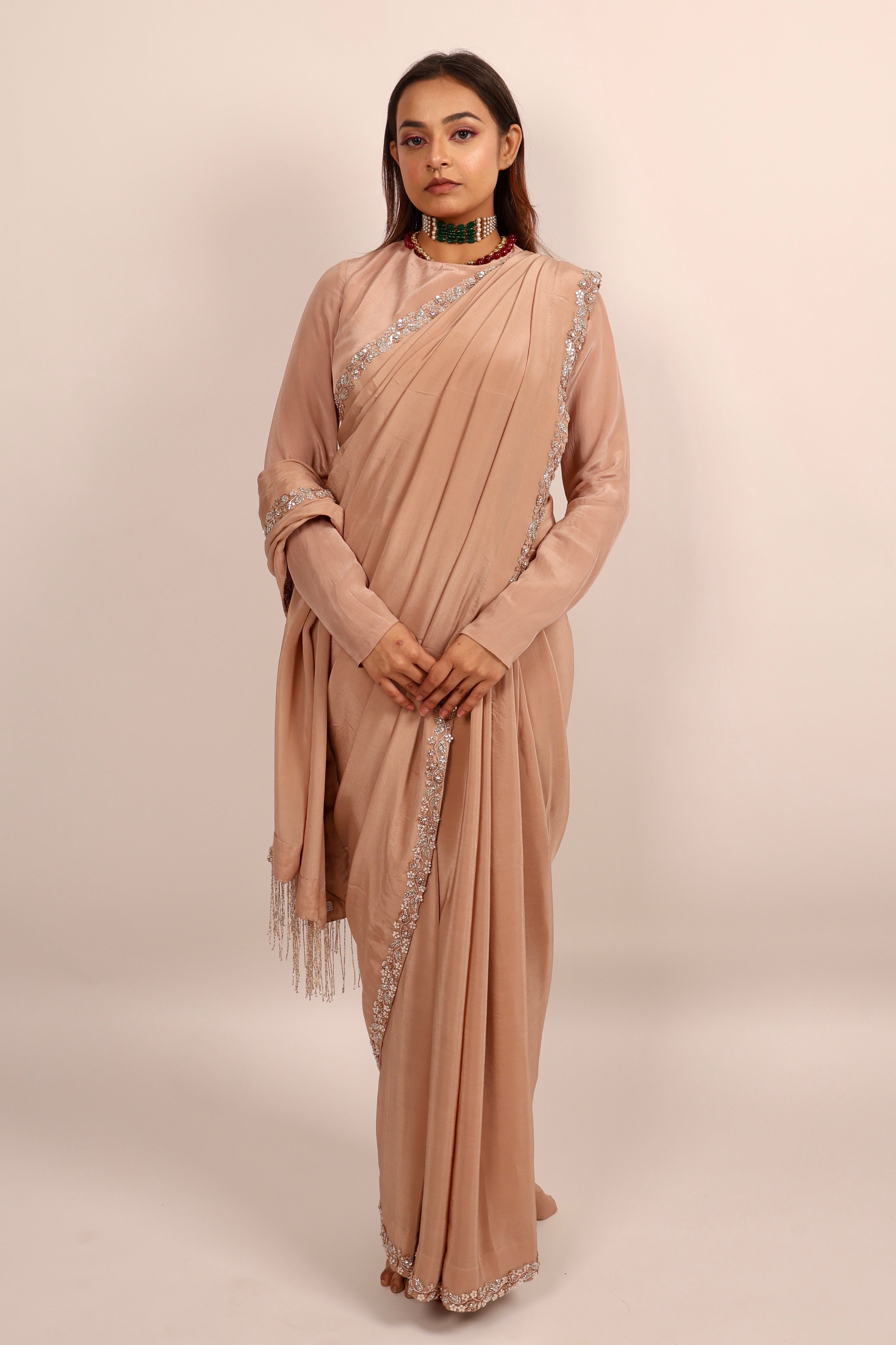 From Rs. 28,000.00From Rs. 28,000.00A nude silk saree with a full-sleeve blouse, finished with delicate sequin and beadwork along the border. Minimal yet sophisticated — perfect for formal events, engagement...