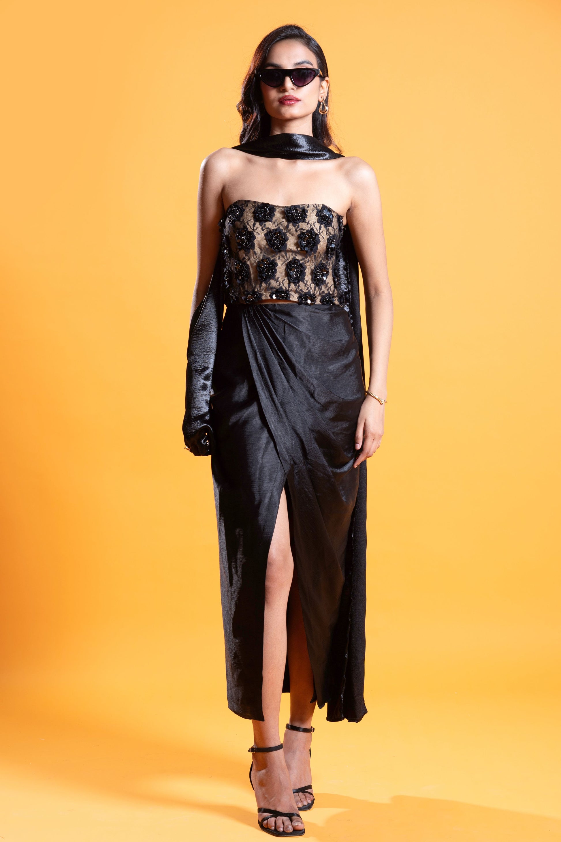 A fluid black draped skirt with a high-slit silhouette, crafted in lustrous fabric for an effortlessly chic look.