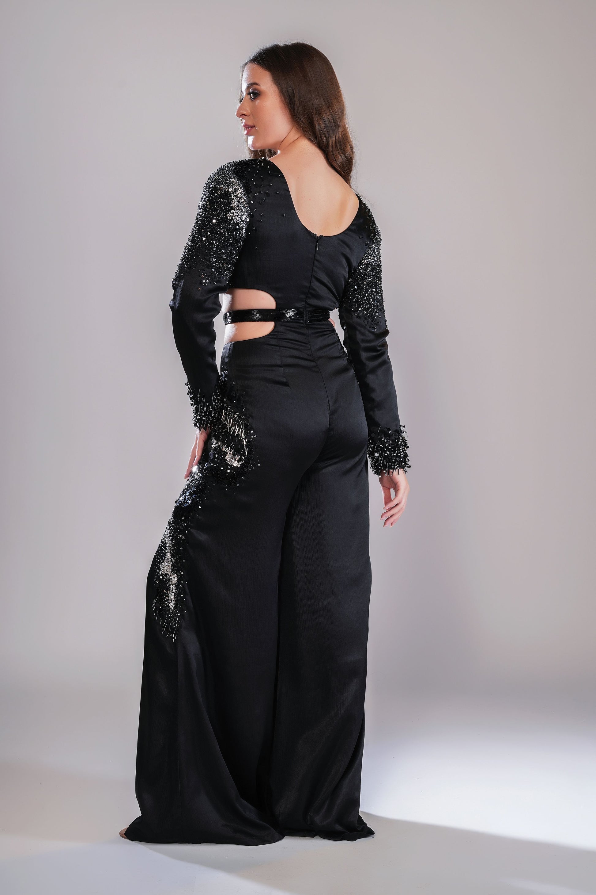 A black jumpsuit featuring an intricate strap design and wide-leg pants with glistening glass beads and intricate sequins embellishment. The jumpsuit is bold yet delicate making it a sophisticated and thought-provoking statement piece.