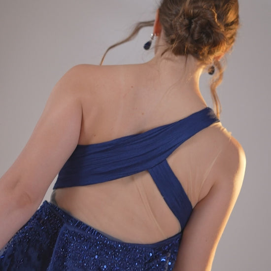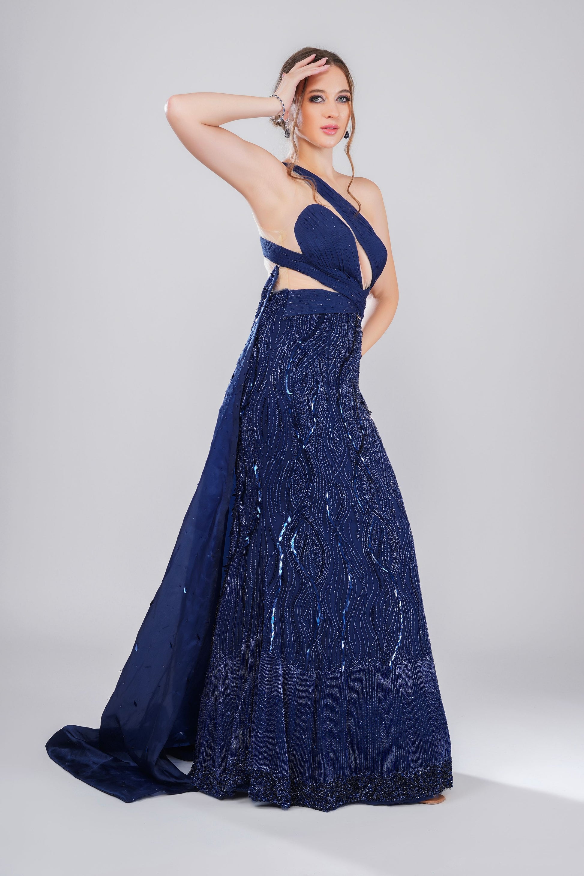 A deep blue handcrafted gown featuring a striking crisscross bodice with shimmering embellishments and floor-length skirt with a detachable embellished veil skirt. The deep blue fabric with pleated sections creates a mesmerizing effect, combining timeless elegance with exquisite twist.