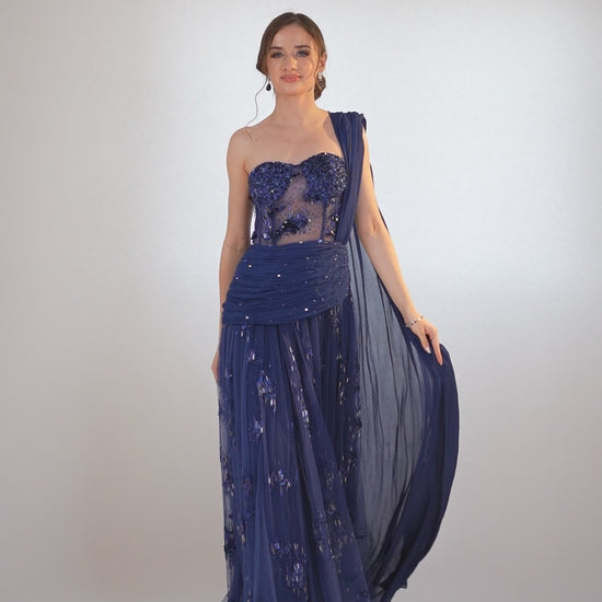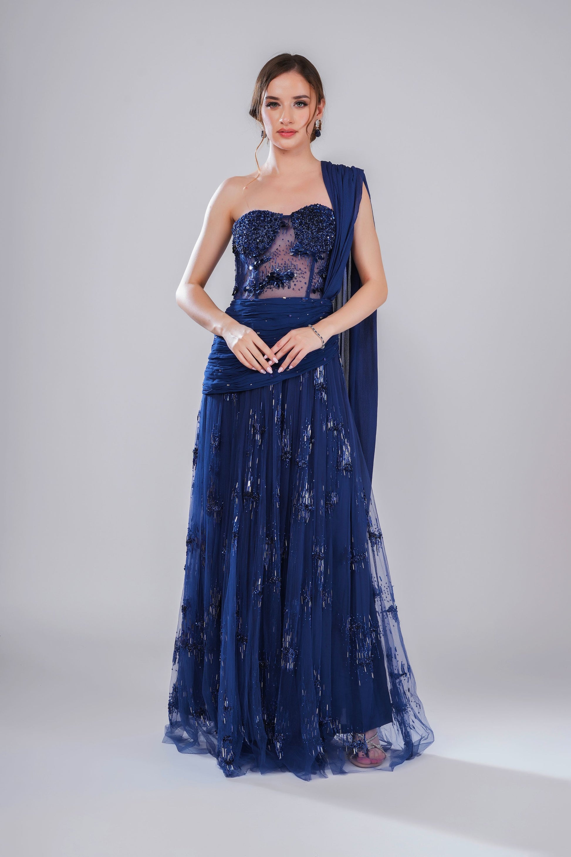 A deep blue gown adorned with sparkling sequins, beads and crystals cascade down this draped long dress. The fitted bodice features a delicate one-shoulder drape, while the skirt boasts elegant draping. Perfect for making a stunning entrance at any occasion.