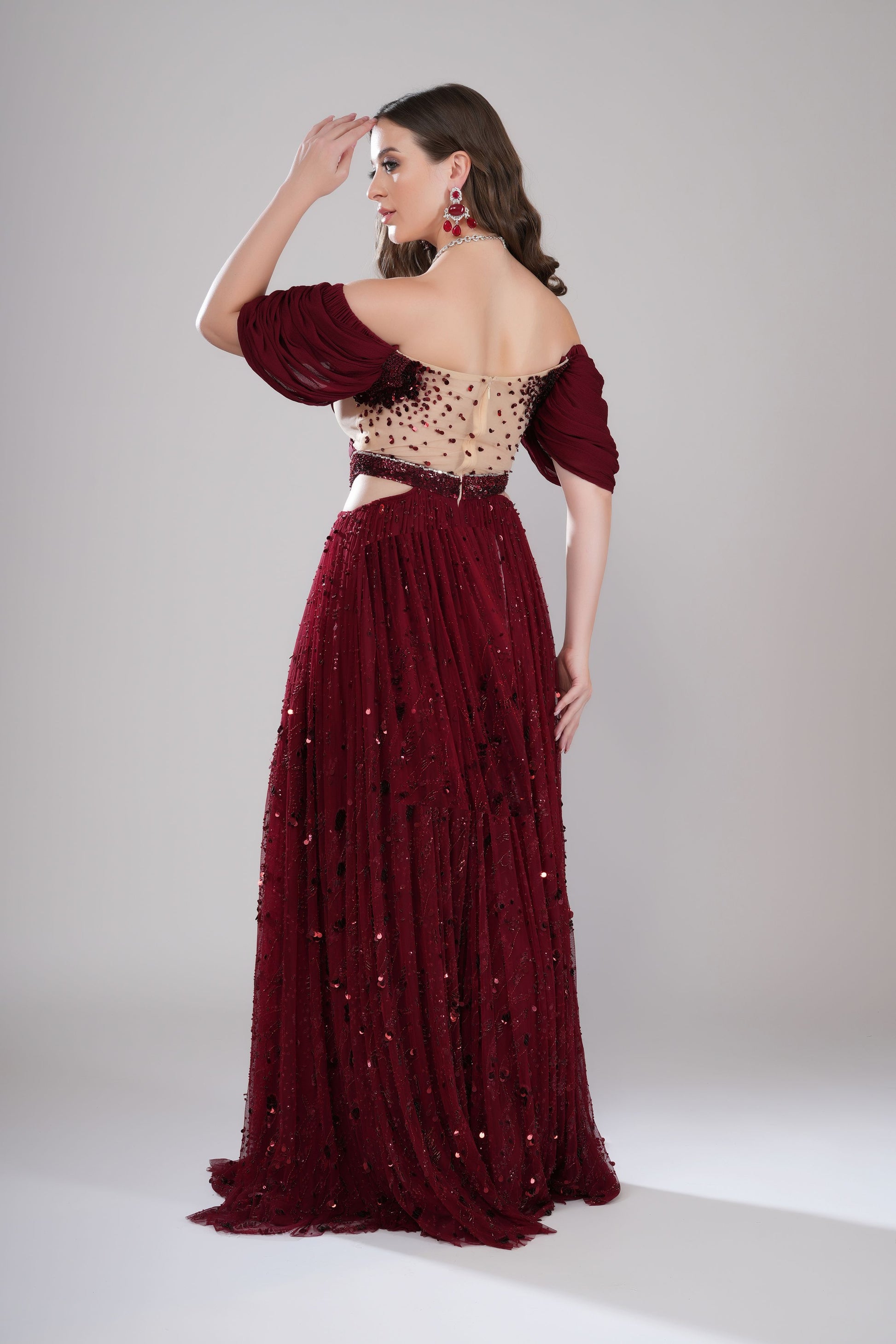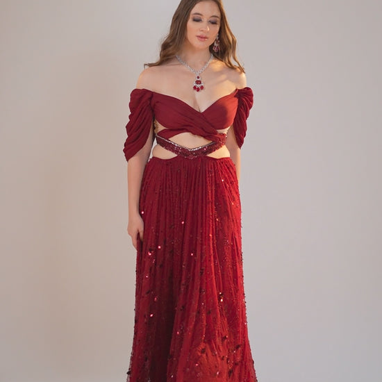 A deep red gown featuring an off-the-shoulder design with a crisscross bodice and shimmering embellishments. The deep red pleated skirt flows gracefully, while cutout details at the waist add a modern twist to this timeless, elegant masterpiece.