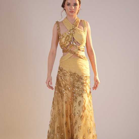 A golden gown featuring a striking crisscross bodice with overlapping straps, a fitted waist, and a flowing, pleated skirt. The golden yellow fabric with shimmering details and fine pleats combines modern chic with timeless elegance.