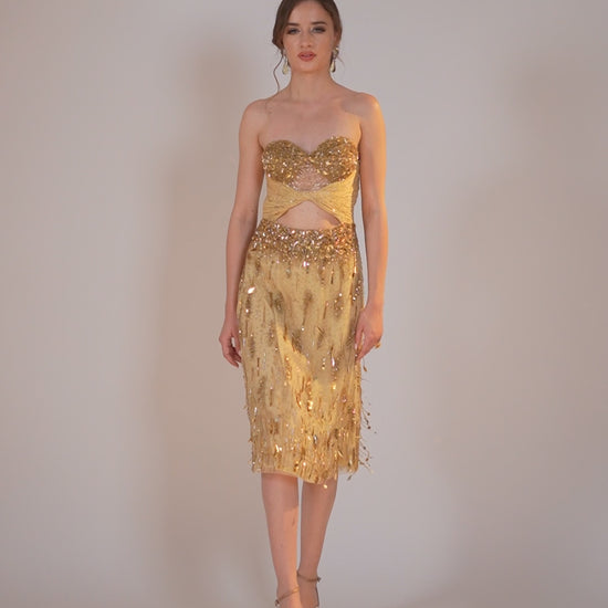 A golden midi dress featuring a strapless sweetheart neckline, intricate pleating, and a striking golden yellow body with hand-embroidered beads, stones, and sequins in a unique pattern. The midi-length dress embodies elegance and grace.