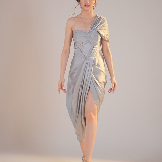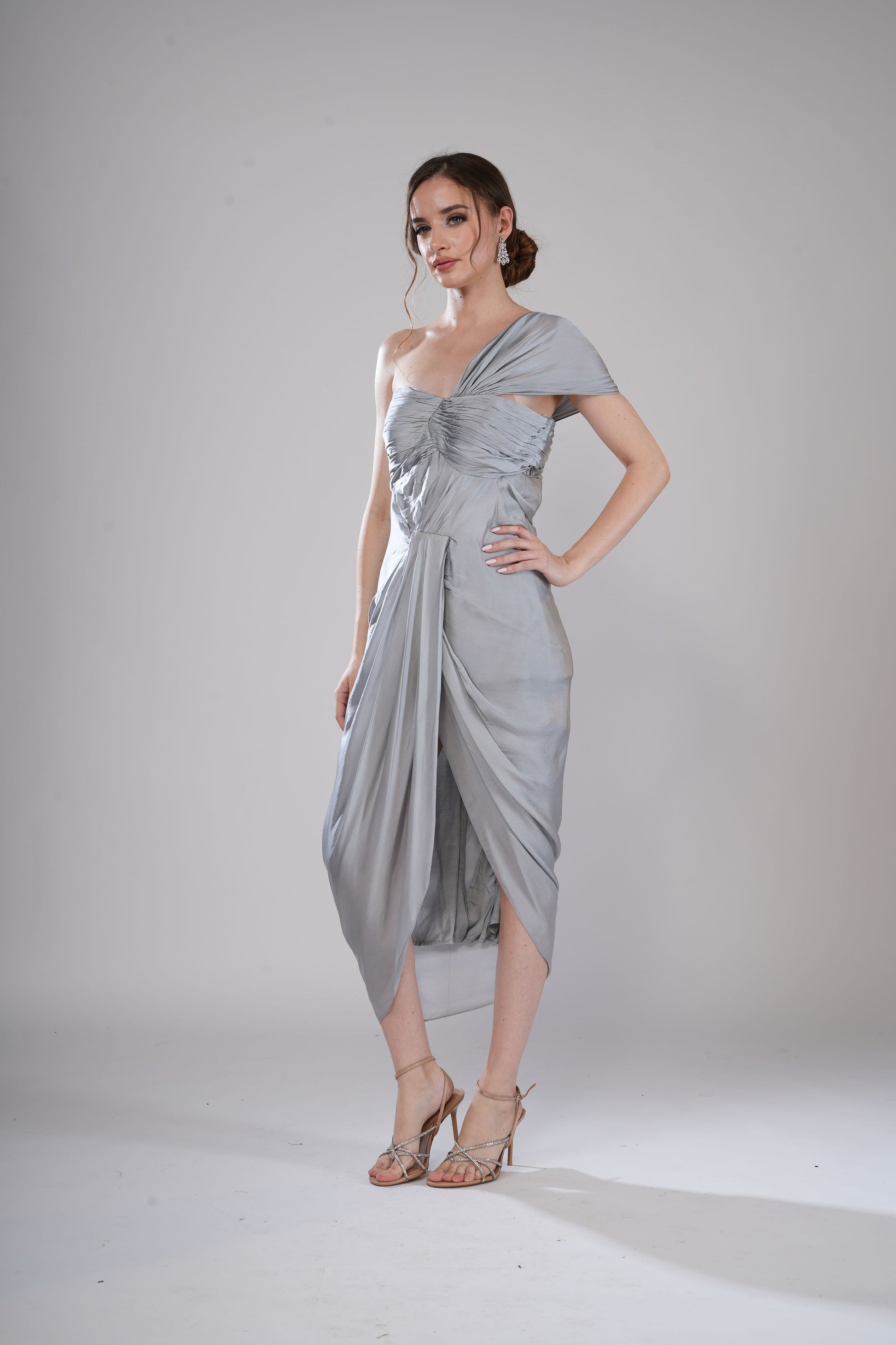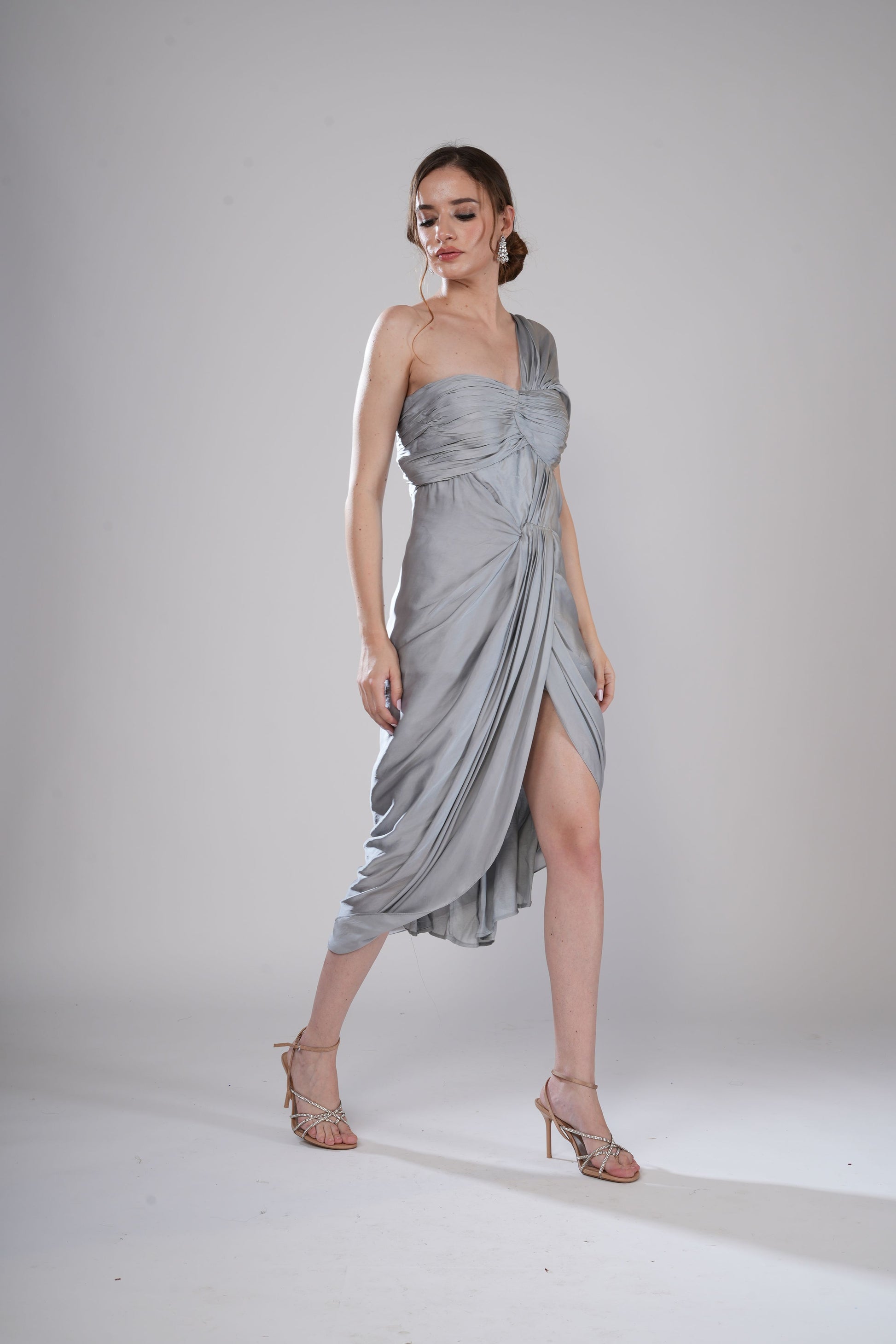 A grey dress featuring an asymmetric one-shoulder design with a draped bodice, fitted silhouette, and an asymmetrical skirt with a high slit. The combination of structure and fluidity creates a unique and stylish silhouette, perfect for any event.