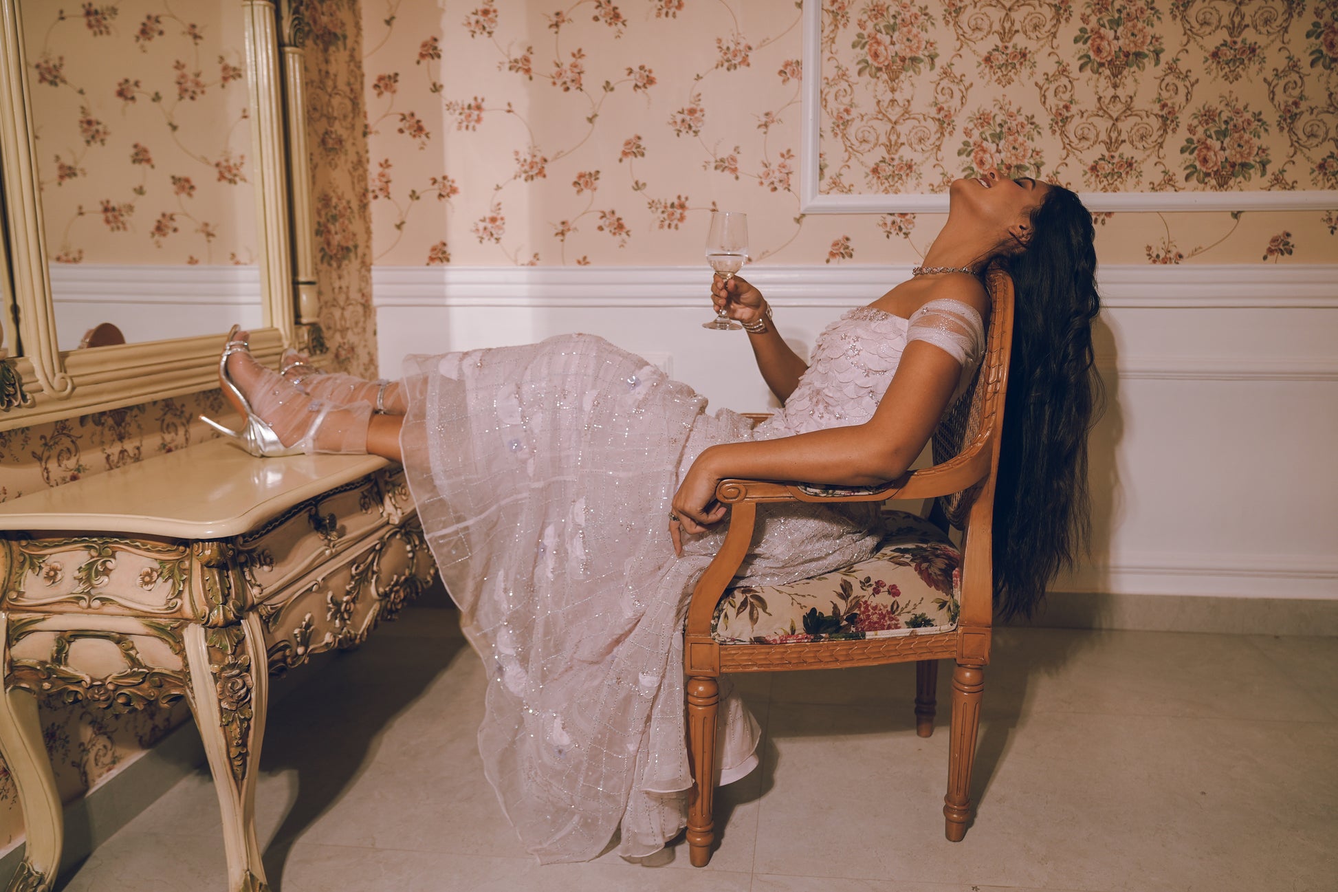A lavender off-shoulder gown with floral appliqué and crystal detailing, flowing gracefully with timeless charm. Designed for soirées, weddings, and modern celebrations.