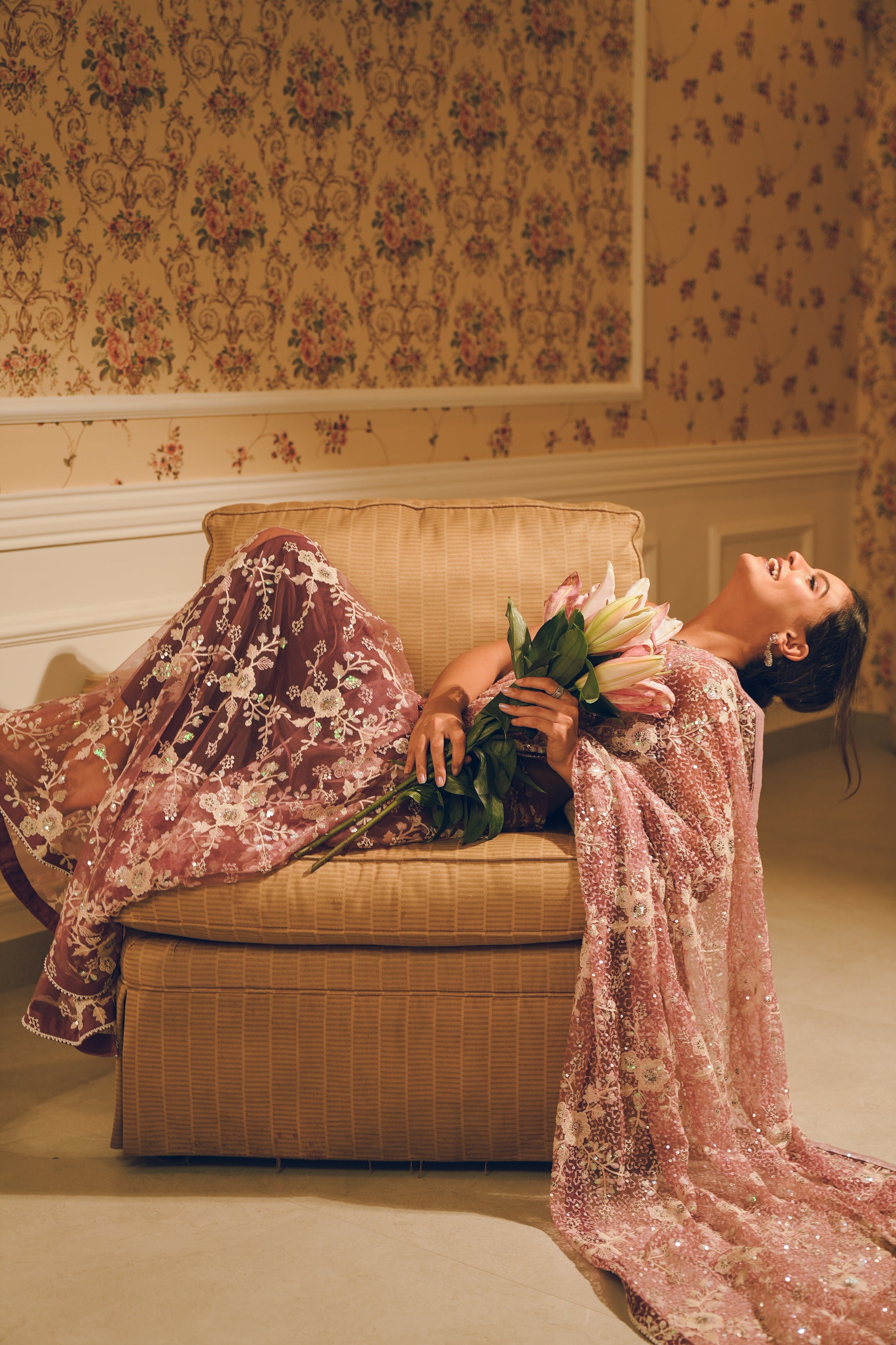 A blush pink hand-embroidered saree with shimmering sequins and delicate floral motifs. Perfect for weddings and evening soirées.