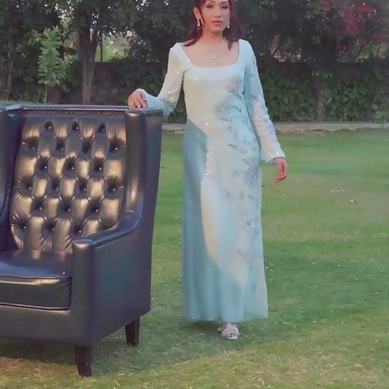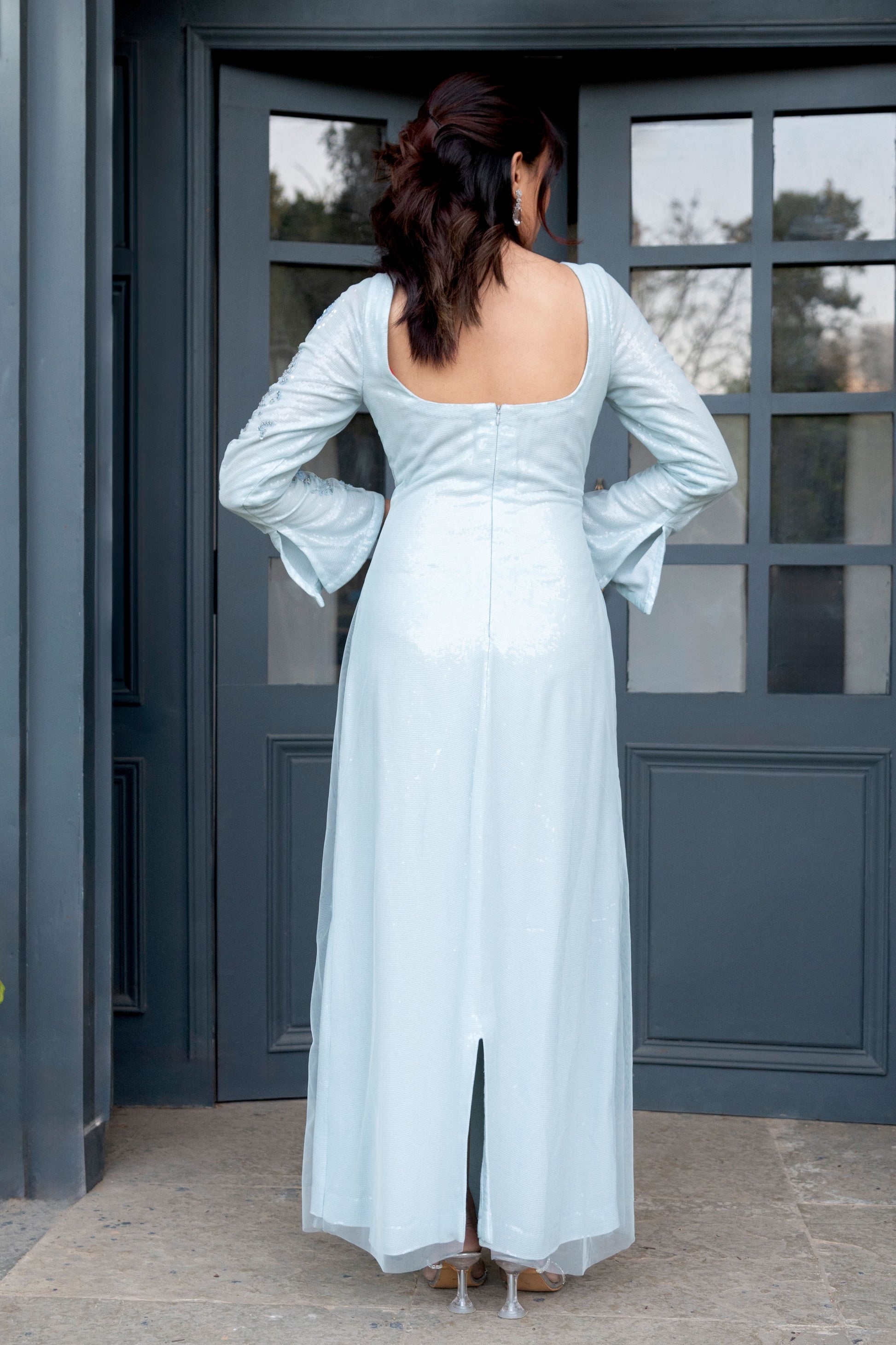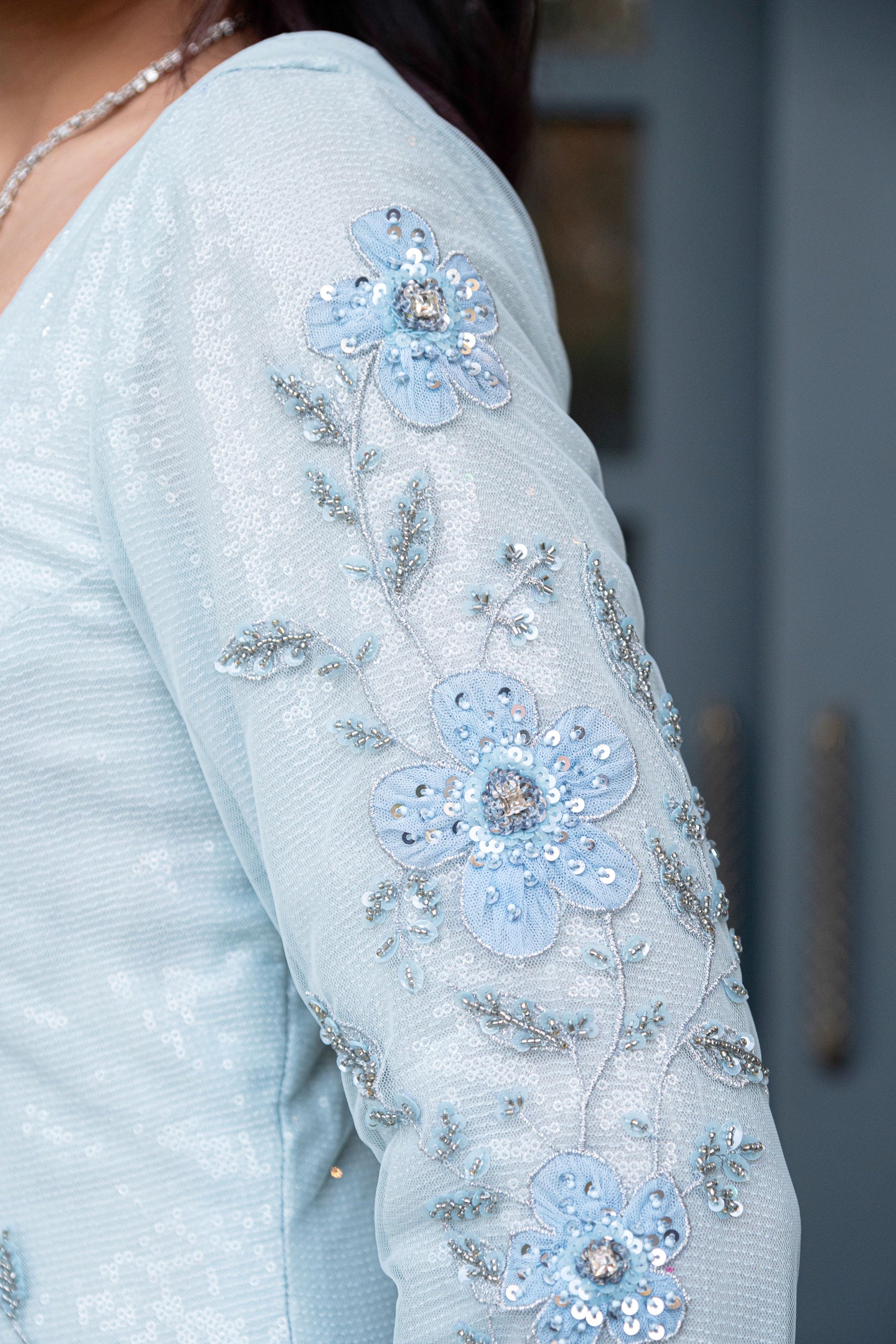 An ice-blue gown with a sculpted fit, delicate floral embroidery, and flared sleeves.
