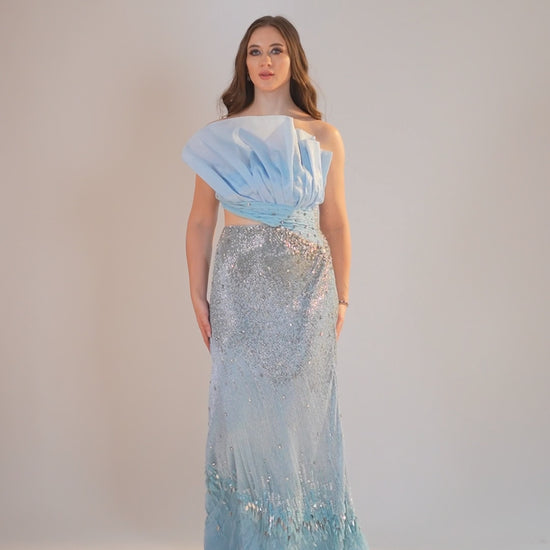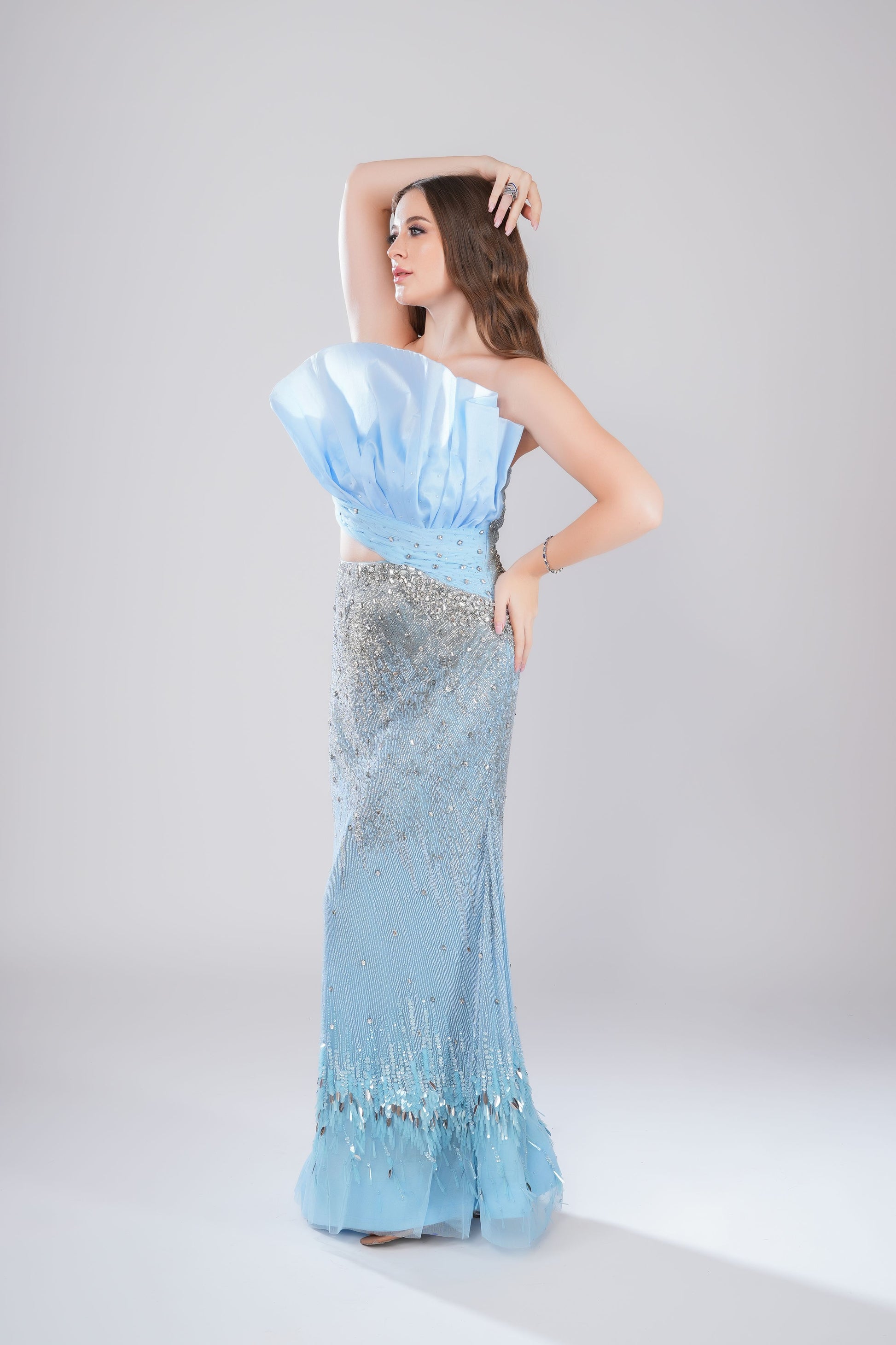 An ice blue gown featuring an asymmetrical sculpted bodice with pleated details, a shimmering ice blue fabric, and a mermaid-style skirt. The intricate design and sparkling embellishments create a dramatic and elegant silhouette, perfect for any occasion.