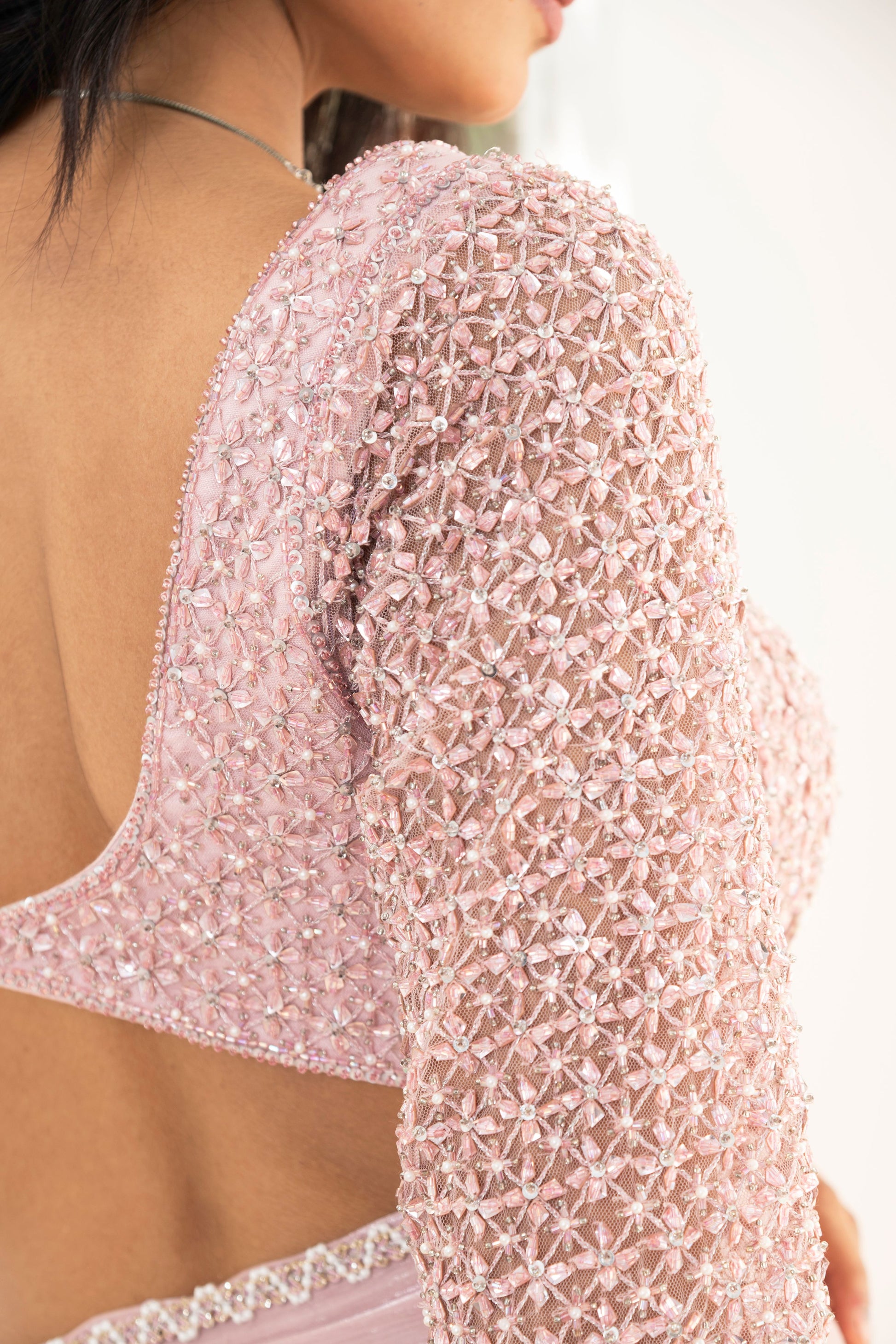 A soft pastel pink saree with delicate lace edging, paired with a hand-embellished blouse featuring intricate embroidery detailing.
