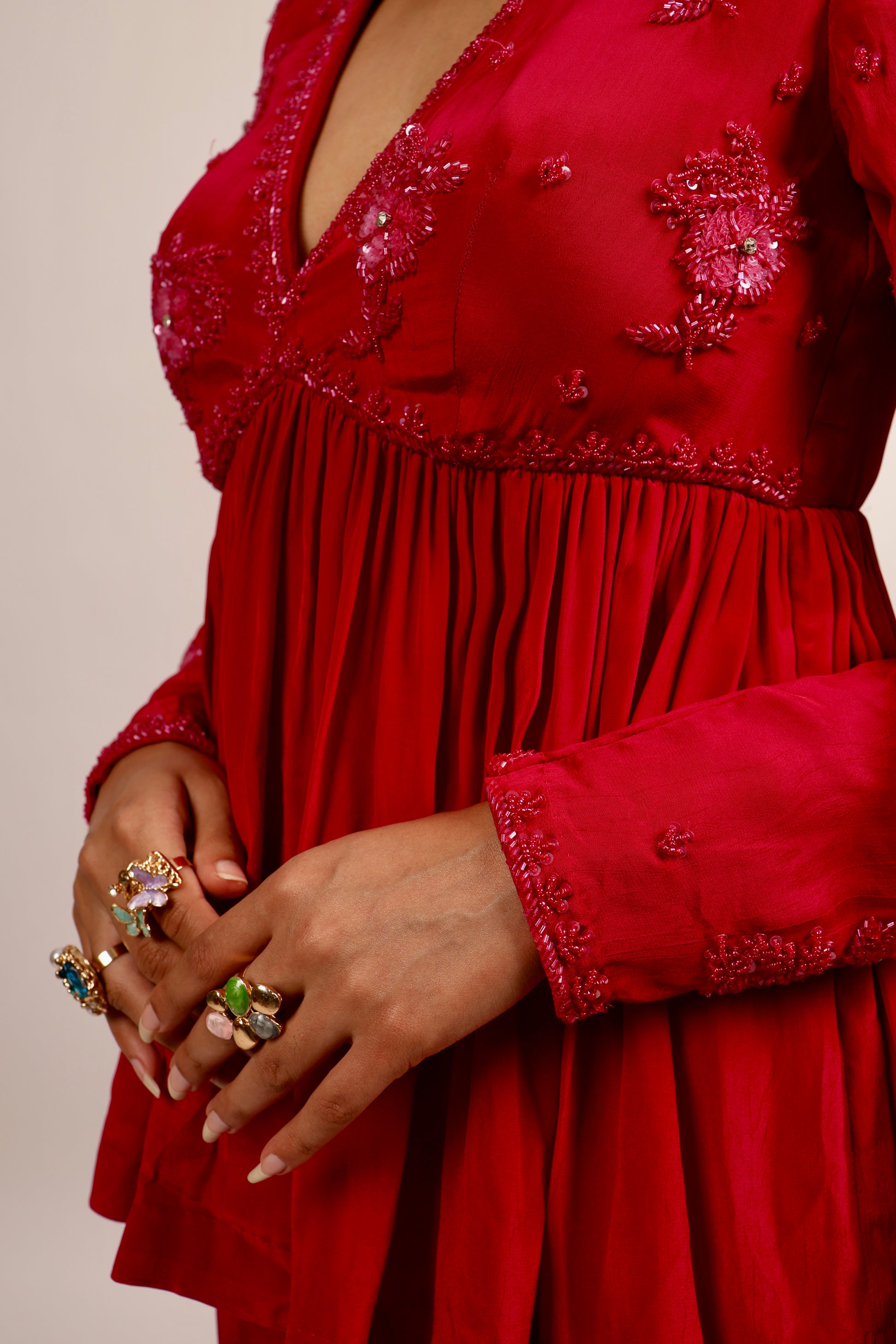 A flowy peplum top paired with wide palazzo pants in a rich pink tone. The top features hand embroidery along the neckline and sleeves, adding shimmer and charm. A versatile festive look — perfect for mehndi, Diwali dinners, or pre-wedding events.