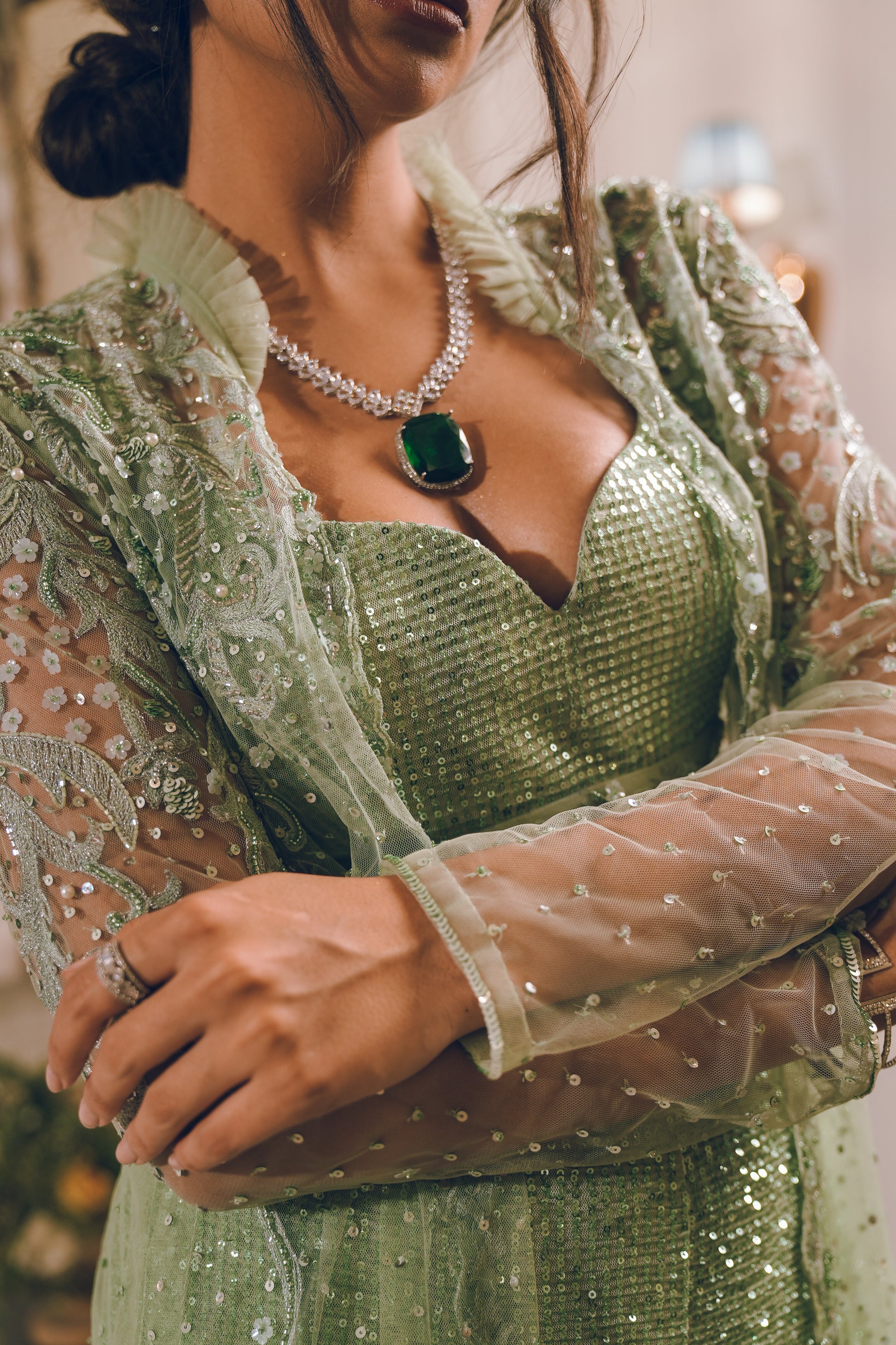 A statement sequin co-Ord set with a sheer embroidered cape and feathered hem detailing, designed for the bold, fashion-forward muse.