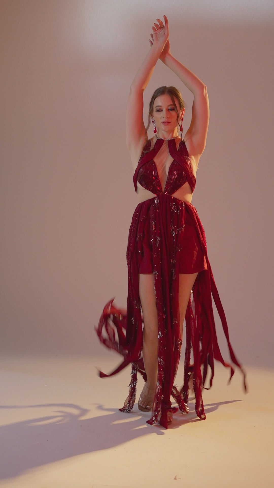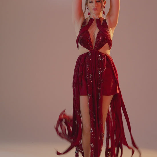 A red gown featuring a crisscross bodice and a dramatic skirt with long, flowing red panels. The skirt is a mix of sheer and solid fabrics with intricate beads and sequin embellishment.