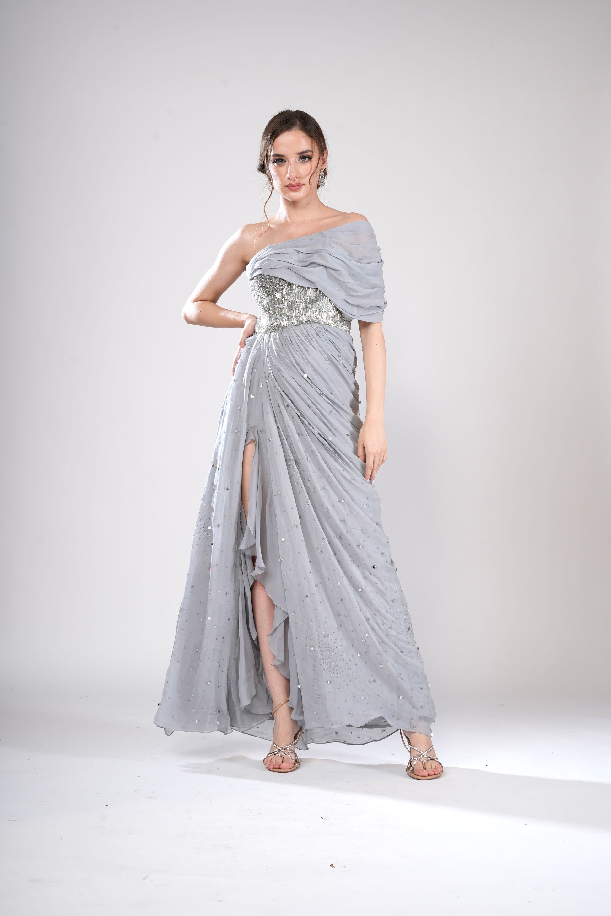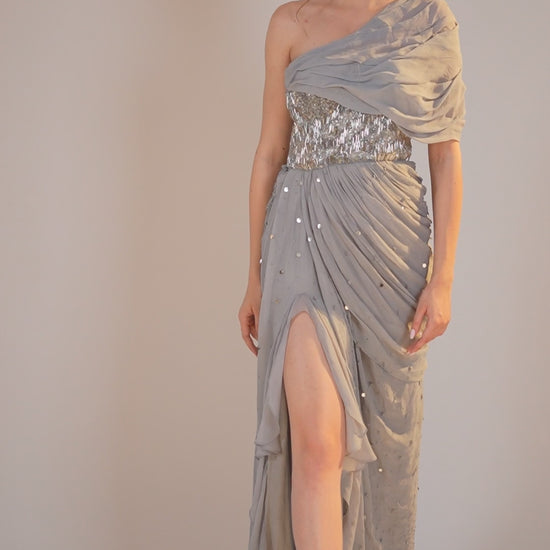 A silver gown featuring an off-the-shoulder draped bodice, a high slit, and asymmetrical ruffles. The structured bodice and flowing skirt create accentuate the waist and give a classy look.