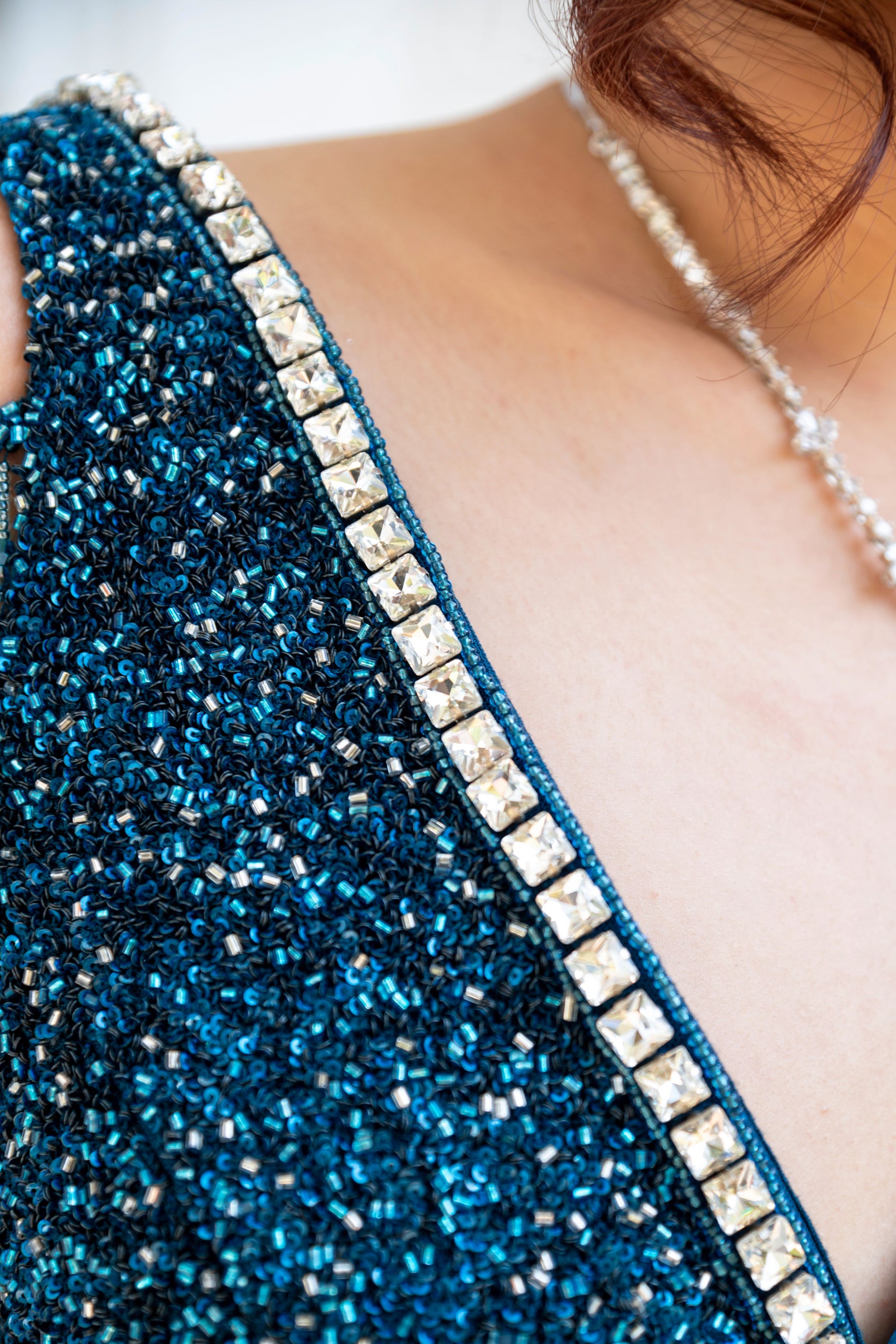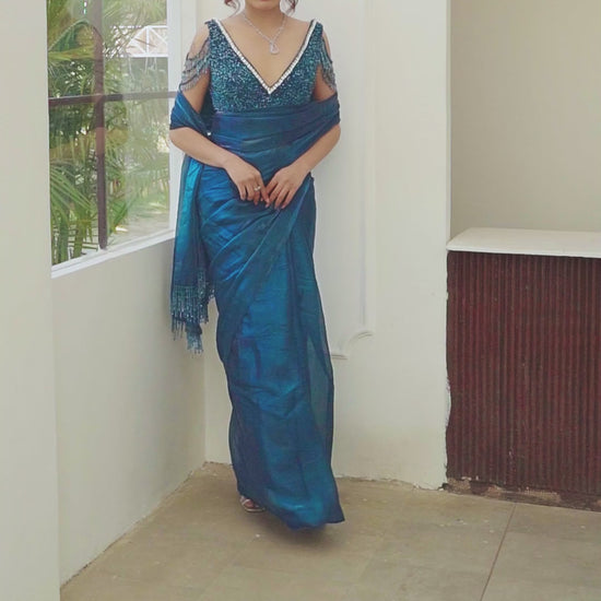 A deep teal glass organza saree paired with a hand-embellished blouse featuring delicate beaded fringe details.