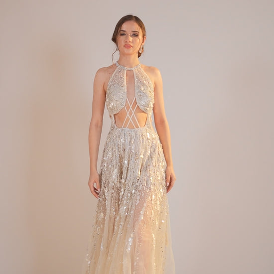 A white gown featuring a high neckline with intricate cutout details, a fitted bodice, and a flowing, floor-length skirt with shimmering embroidery. The bodice has crisscross straps adorned with crystals, giving the entire dress an overall delicate look.